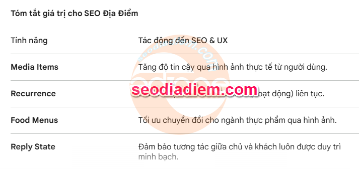 Ảnh do người dùng tải lên ở phía trước và trung tâm – Google không chỉ đọc các bài đánh giá nữa mà còn xem xét chúng. Thẻ do người dùng tạo đang gắn nhãn doanh nghiệp của bạn cho các mô hình của Google (bầu không khí, độ sạch sẽ, thời gian phục vụ, đặc sản). “Báo cáo hành vi kinh doanh” hiện là hành động một lần nhấn trong Maps, nhằm mục đích trực tiếp thông tin một cách trực tiếp cho đội ngũ quản trị doanh nghiệp của google.