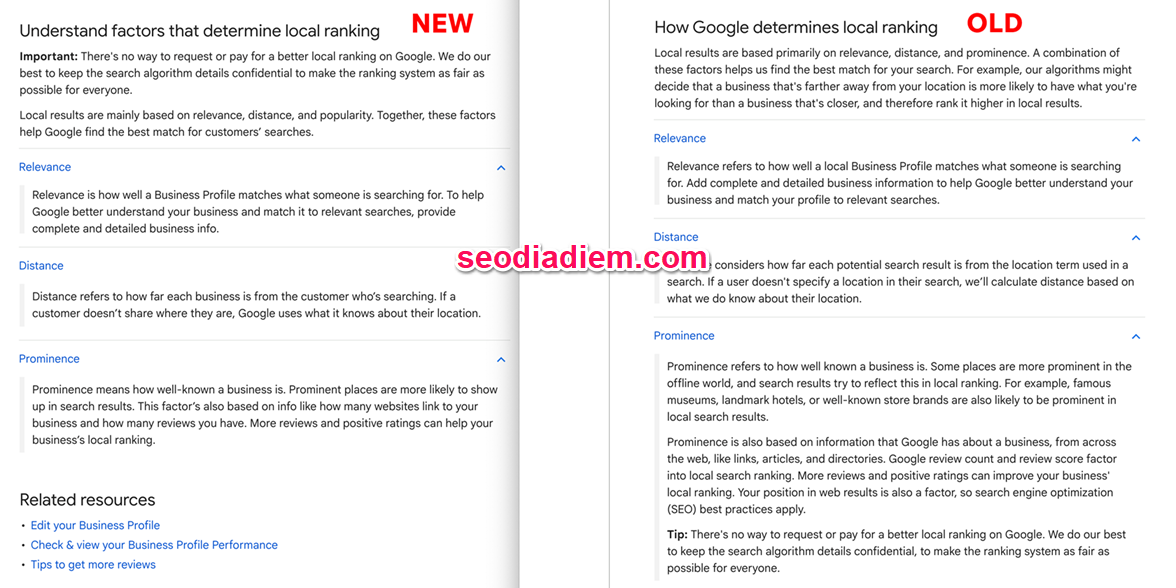 Họ cũng đơn giản hóa những gì góp phần tạo nên sự nổi bật. Văn bản CŨ đề cập: “… liên kết, bài viết và thư mục.” Văn bản MỚI bây giờ nói: “… có bao nhiêu trang web liên kết đến doanh nghiệp của bạn và bạn có bao nhiêu đánh giá.”