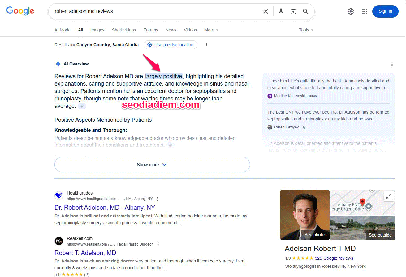 Google dường như đang sử dụng các bài đánh giá trên danh sách Hồ sơ doanh nghiệp trên Google của bạn để đưa ra câu trả lời trong Tổng quan về AI của mình. Nếu bạn tìm kiếm các bài đánh giá bác sĩ yêu thích của mình, bạn có thể thấy Google trích dẫn các bài đánh giá được liệt kê trong phần đánh giá của Hồ sơ doanh nghiệp trên Google của bạn.