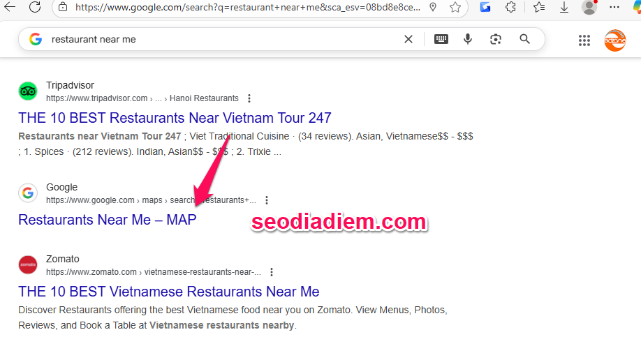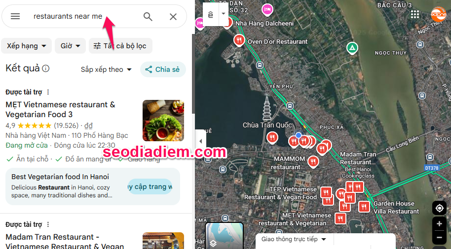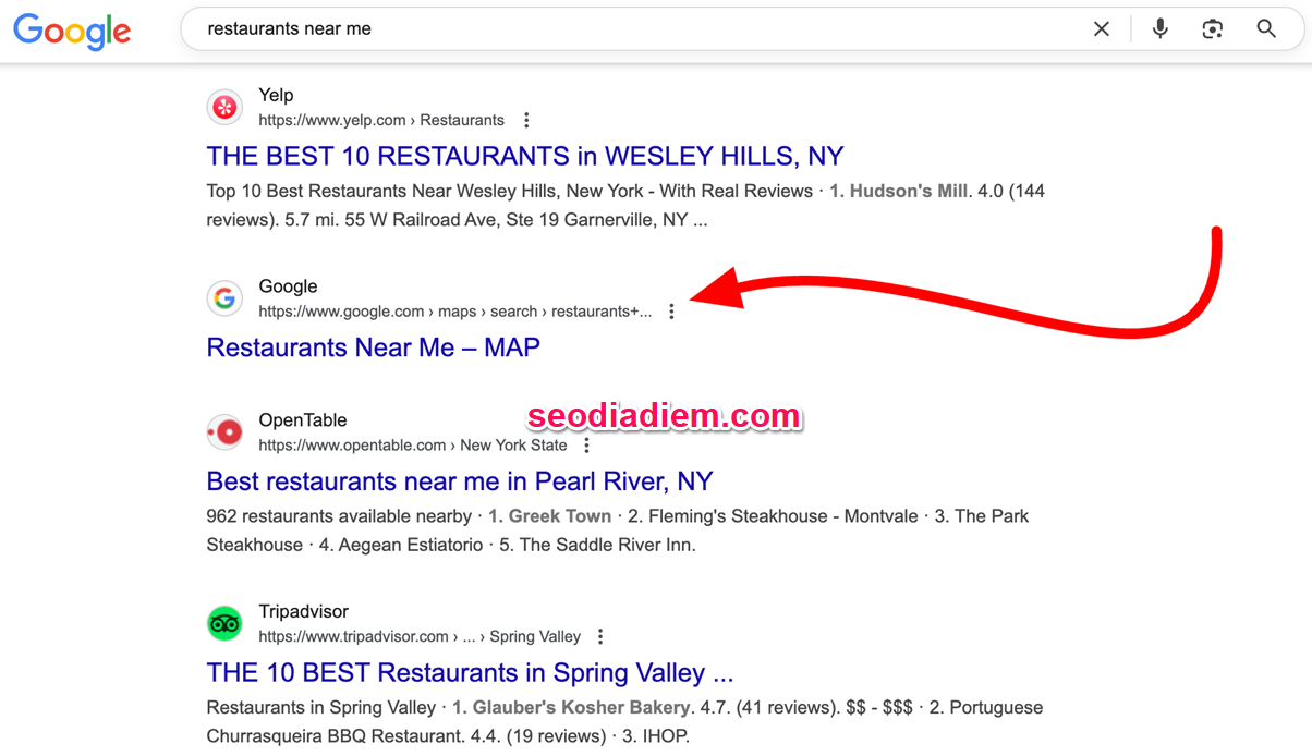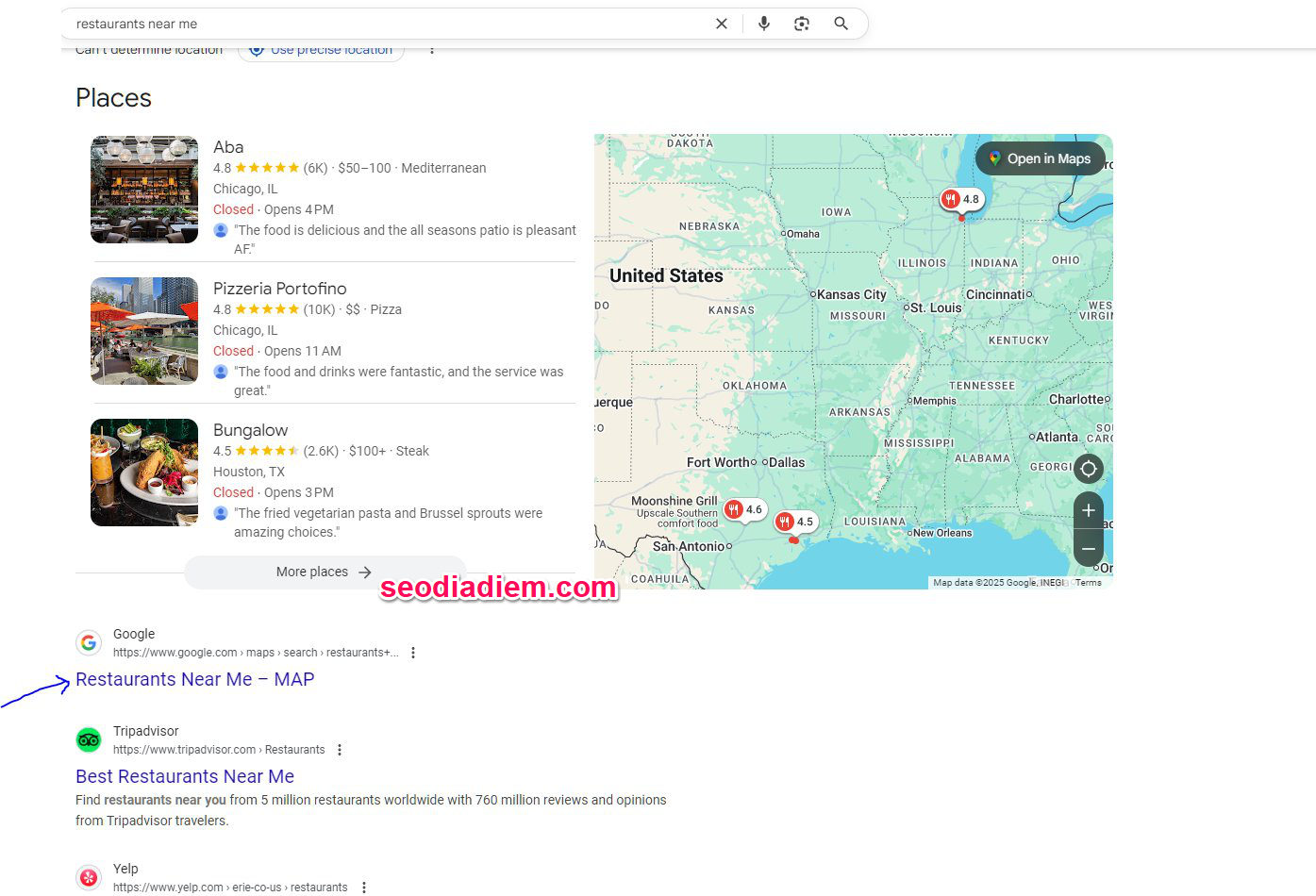 Khi tôi bấm vào liên kết đó thì nhận thấy rằng nó ra kết quả tìm kiếm google.com/maps/search/restaurants+near+me/ thì nó trả về trên google maps, với các xếp hạng các nhà hàng đang chạy quảng cáo, và thứ tự những quấn ăn có lượng review khủng, có thể google dựa vào lượng tương tác trên google maps, như người dùng ghé thăm, hay tăng đánh giá trên google maps để xếp hạng lên top